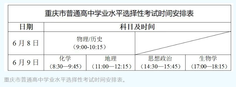 重庆市统一高考实行“3+1+2”模式,即全国统考语文、数学、外语3科,以及考生从普通高中学业水平选择性考试6科中选择的3科。其中,物理、历史为首选科目,考生只能且必须选择其中1科报考;思想政治、地理、化学、生物学4科为再选科目,考生只能且必须选择其中2科报考。
